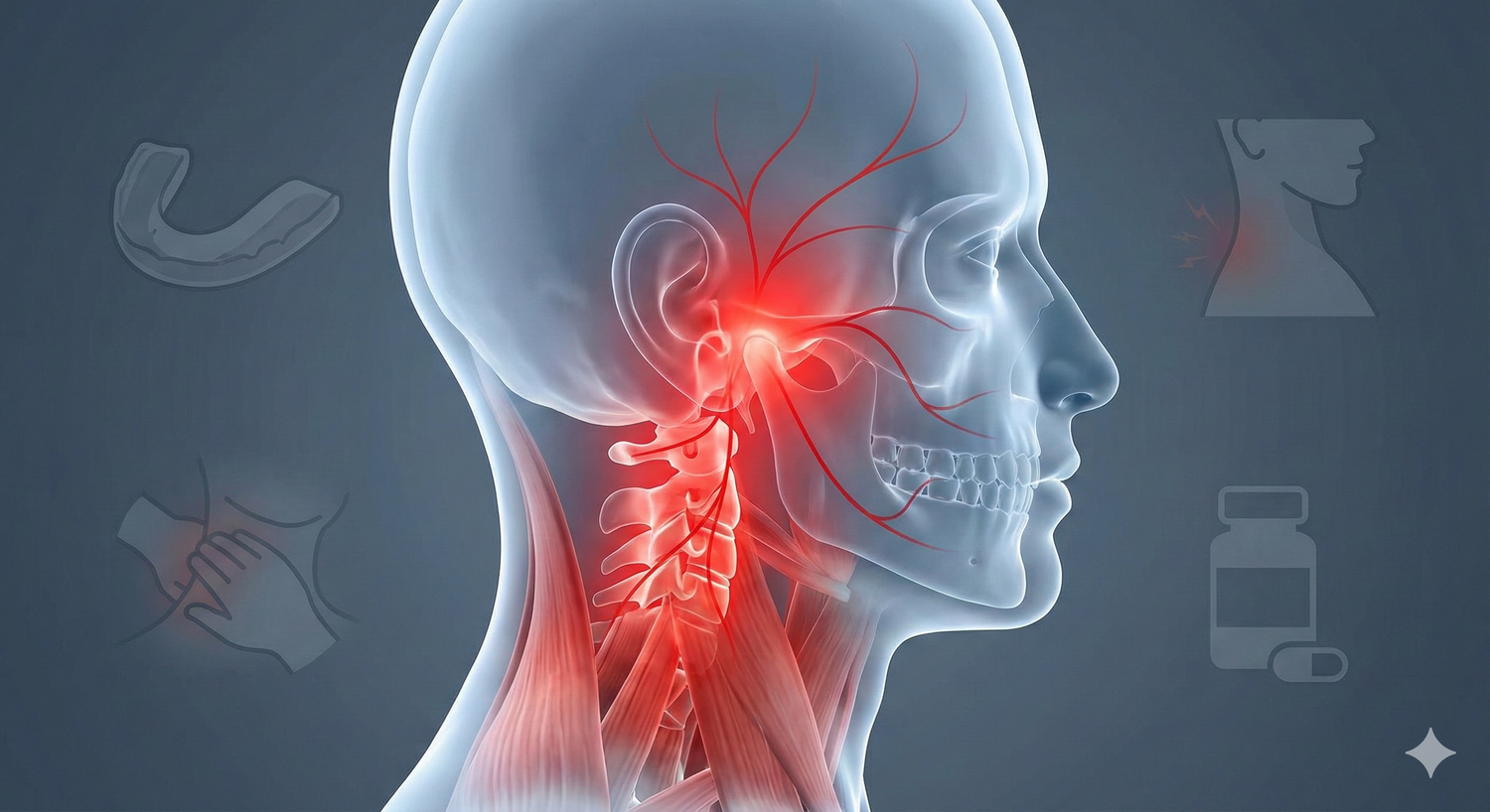 Jaw pain, clicking, TMJ flare-ups, and deep tightness — along with pain spreading into the temples, forehead, around the ear, and down the neck.