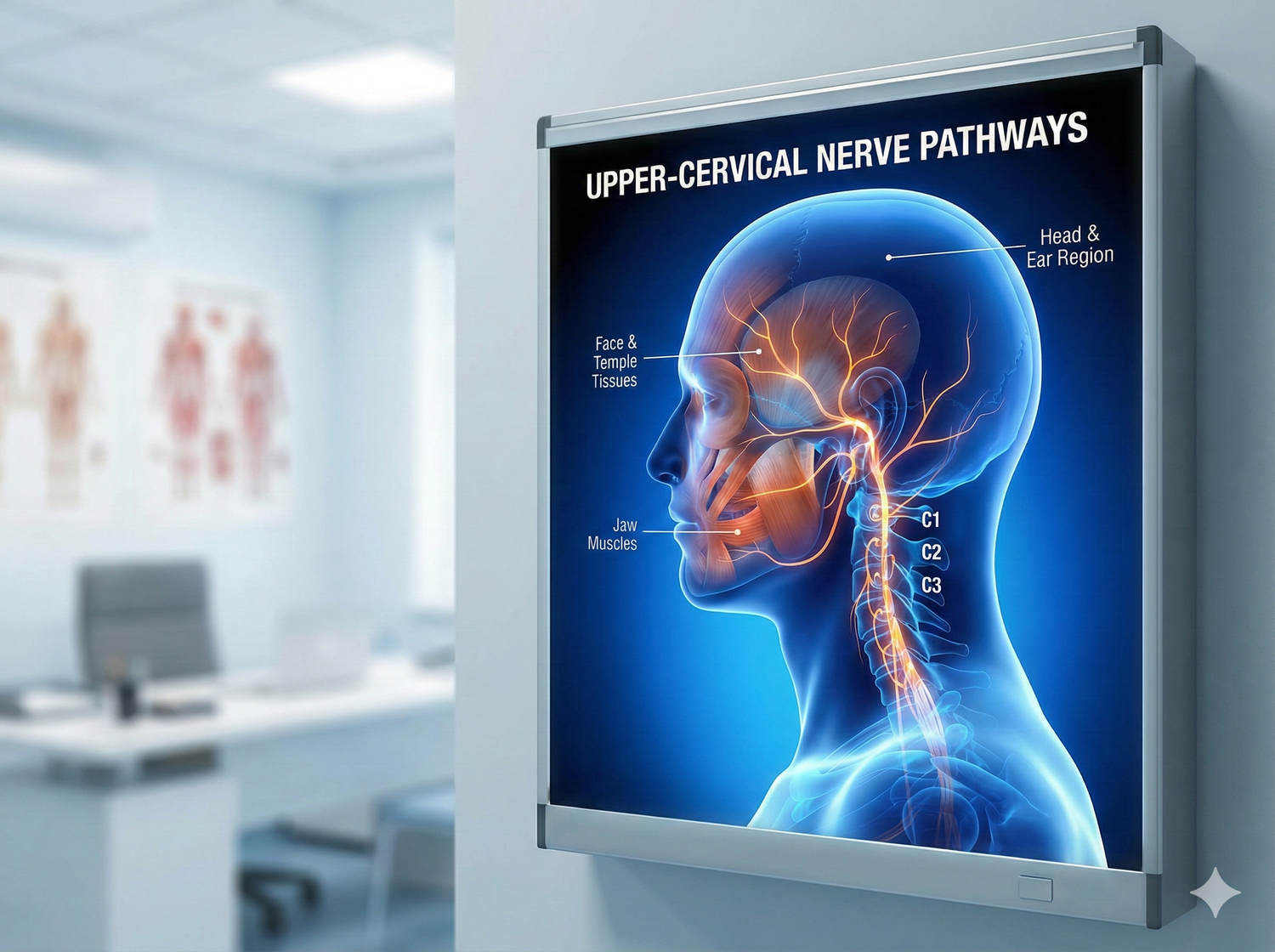Right beneath the base of your skull sits a small but powerful hub where the upper cervical nerves — C1, C2, and C3 — converge and interact with the nerves that control your jaw, face, temples, and parts of your head.